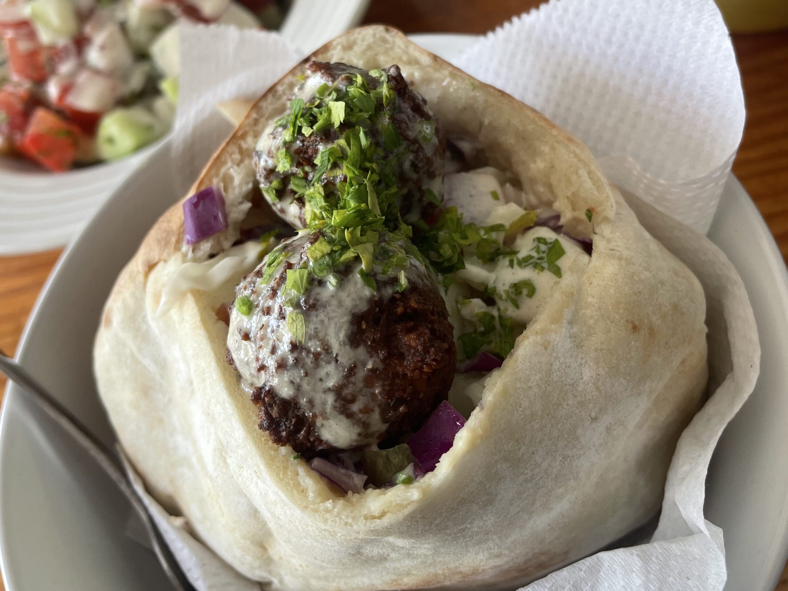 Stuffed with falafel, hummus, cucumber, tomato, onion, parsley and lemon. Super satisfying.