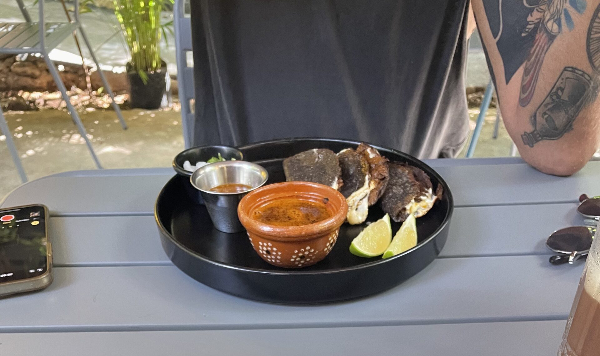 Three blue corn sopes with beans, homemade sauce, lettuce, crema, red onion and plant-based pastor.